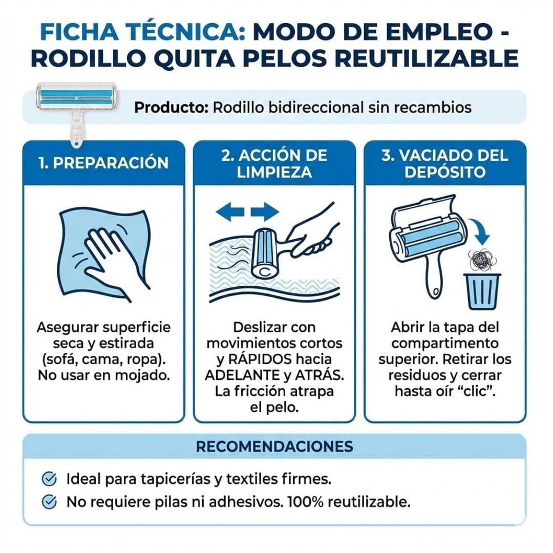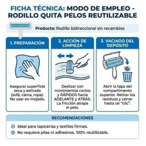 Rodillo Reutilizable de Alta Eficiencia: Diseñado para superficies grandes como sofás, camas y mantas. Sin necesidad de repuestos adhesivos, atrapa todo el pelo con pasadas rápidas de ida y vuelta.